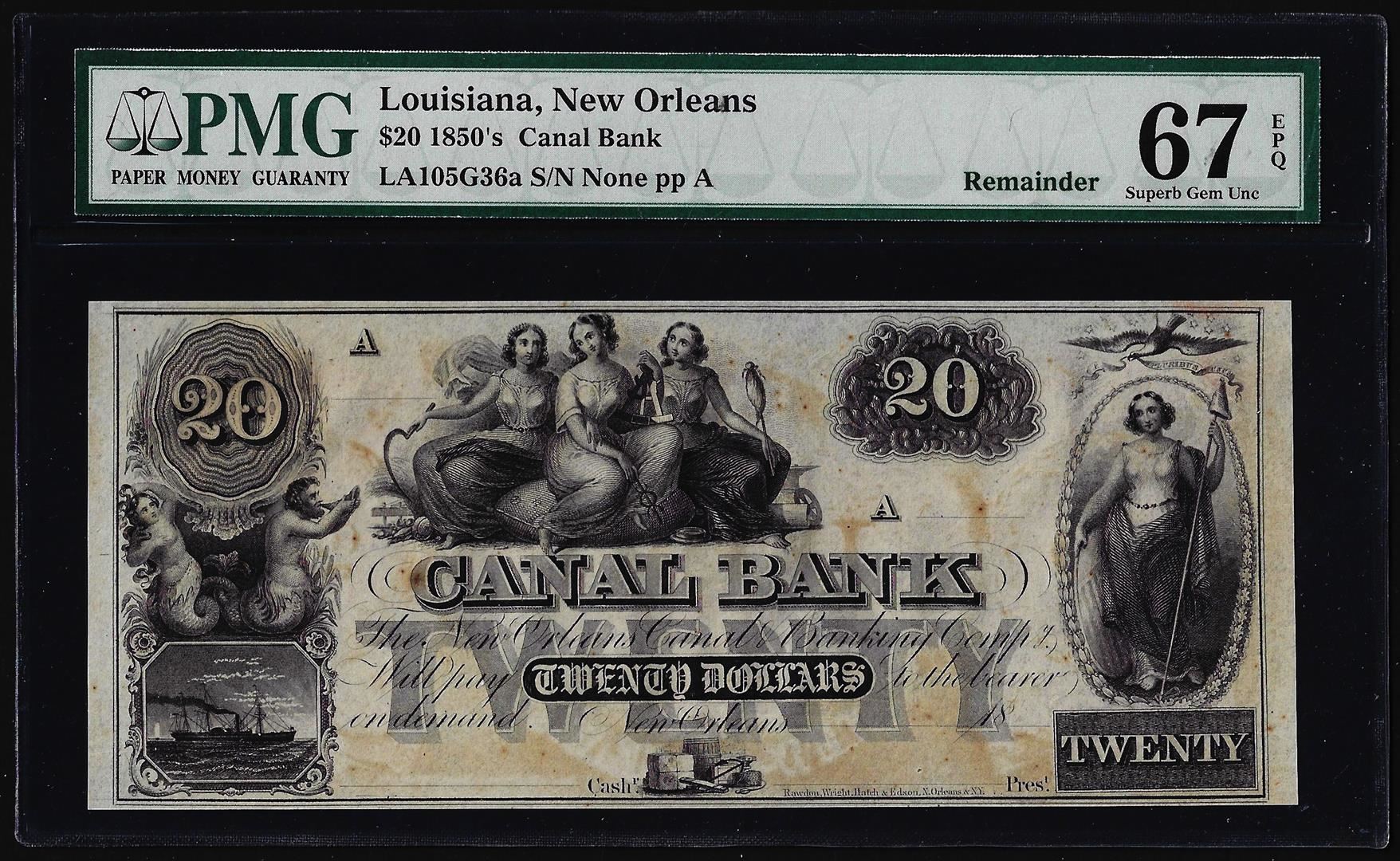One 1850's $20 Canal Bank New Orleans Obsolete Bank Note PMG Superb Gem Unc 67EPQ. PMG Certified.