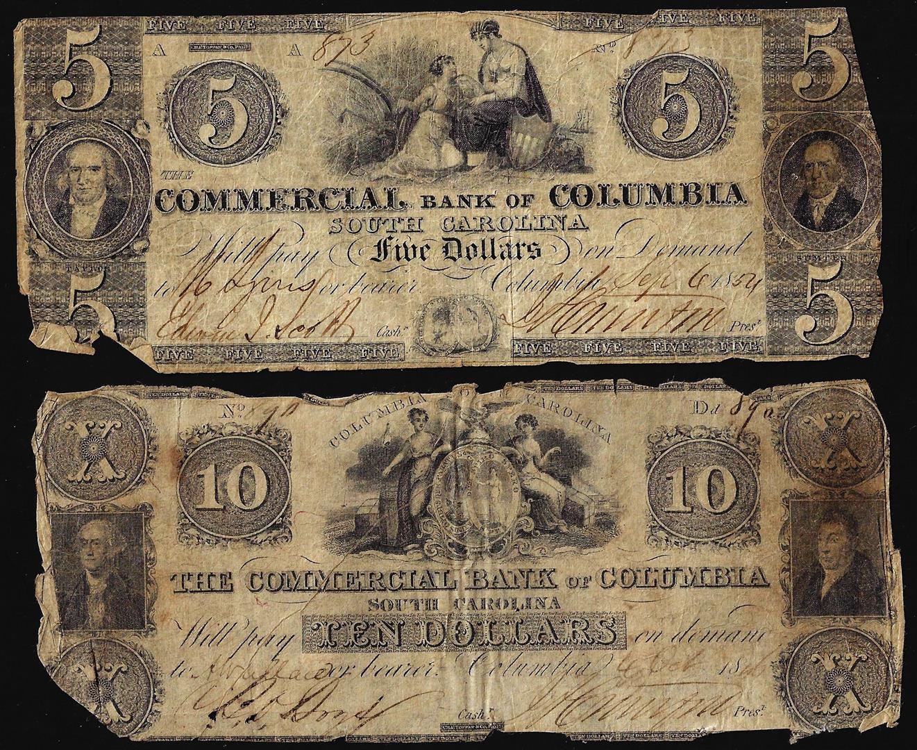 1850's $5 & $10 Commercial Bank of Columbia South Carolina Obsolete Banknote
