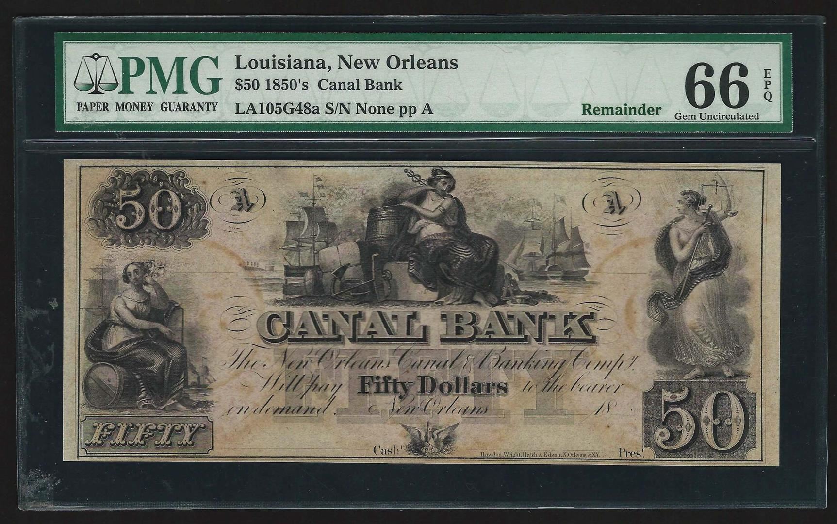 1850's $50 New Orleans Canal Bank Obsolete Note PMG Gem Uncirculated 66EPQ