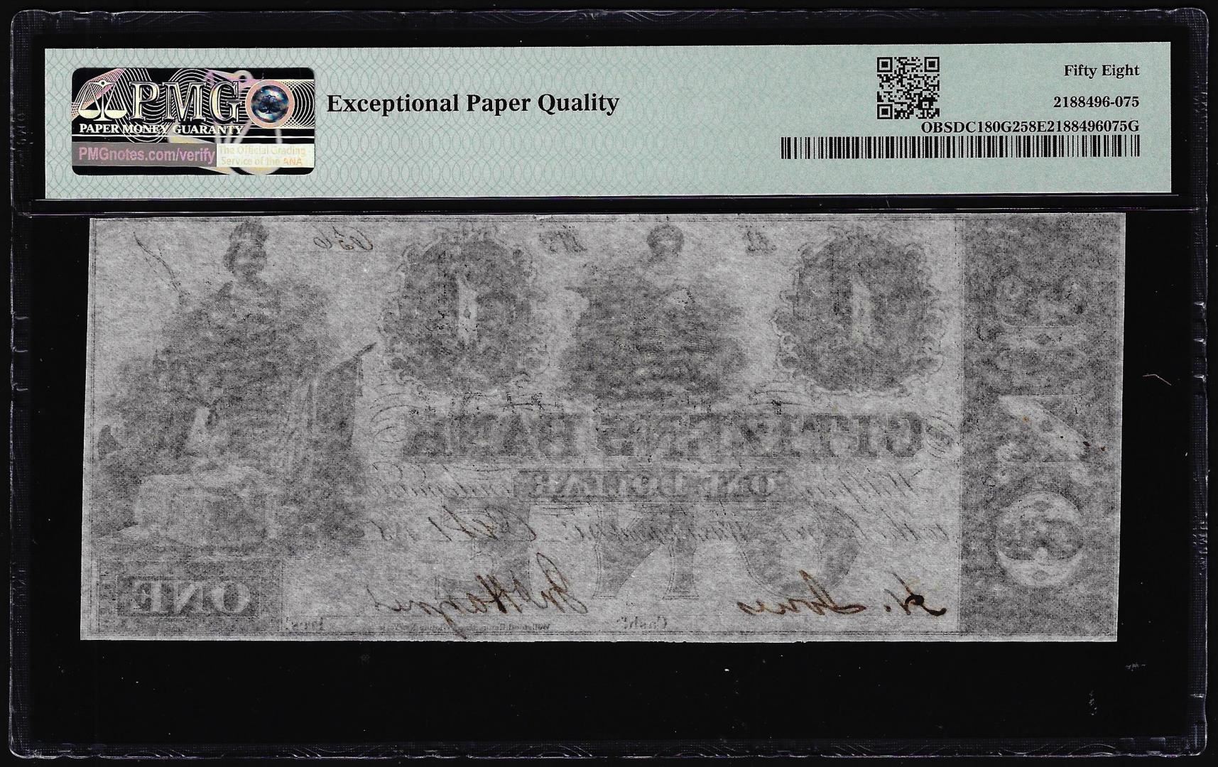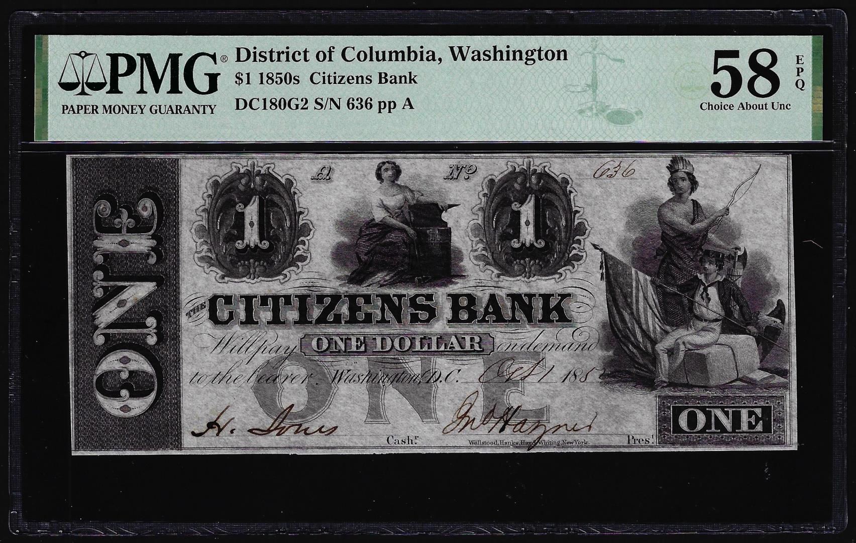One 1850s $1 Citizens Bank District of Columbia Obsolete Note PMG Choice About Unc 58EPQ. PMG Certified.