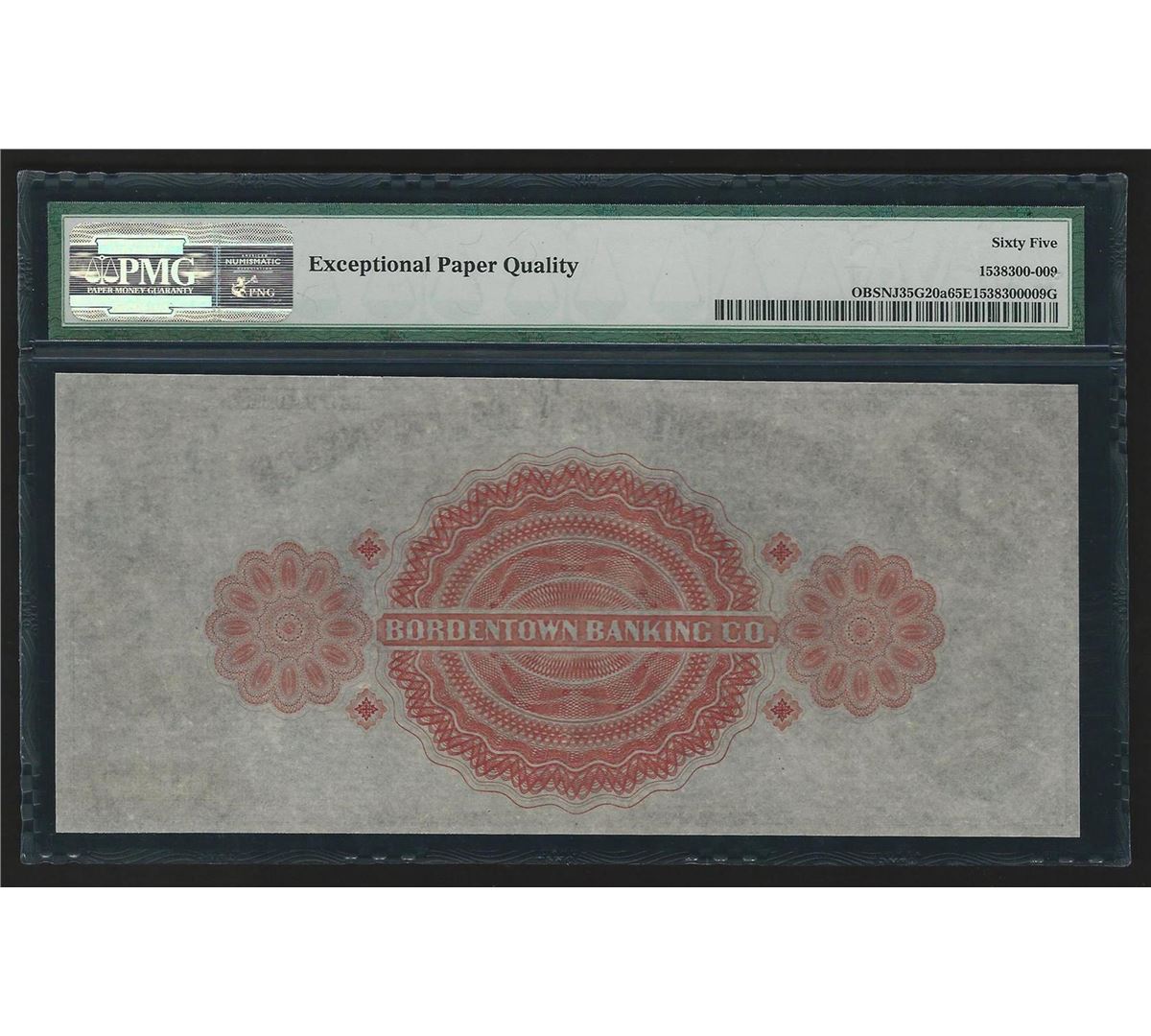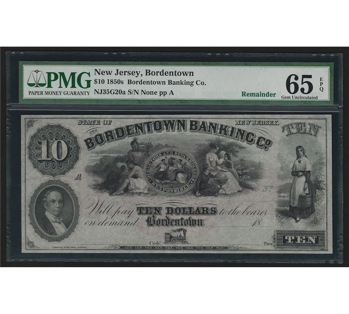 One 1850s $10 Bordentown Banking Co. Obsolete Bank Note PMG Gem Uncirculated 65EPQ. PMG Certified.