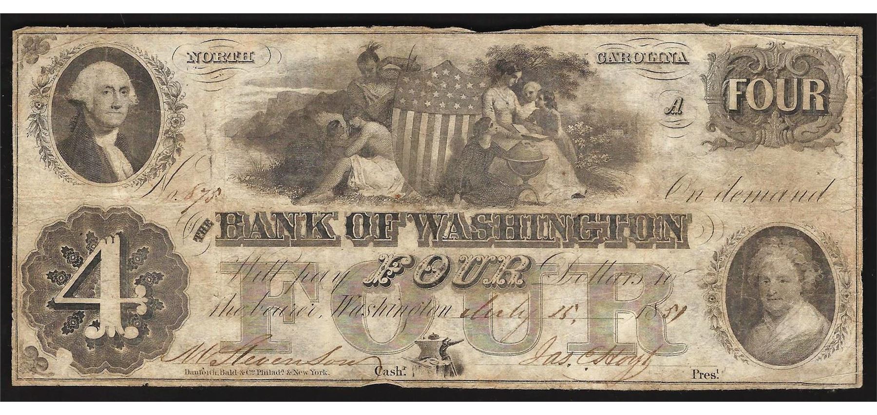 One 1850s $4 The Bank of Washington Obsolete Bank Note.