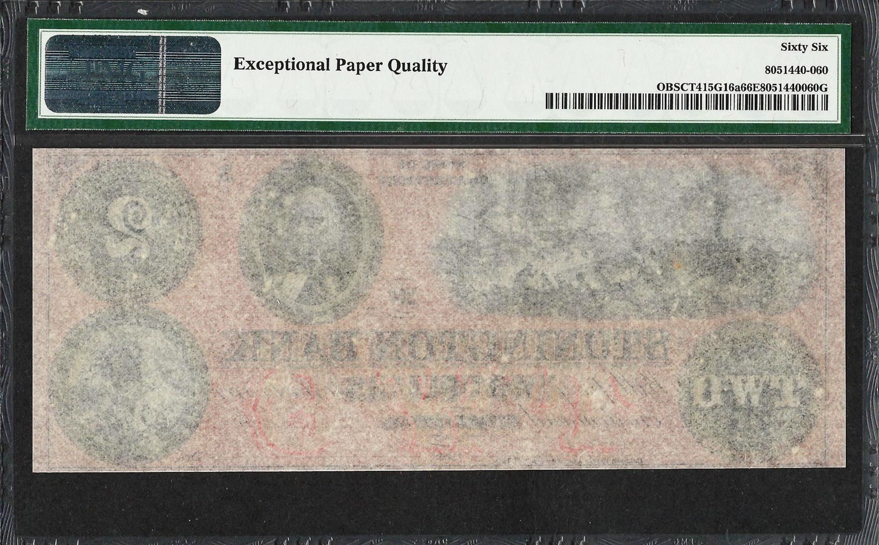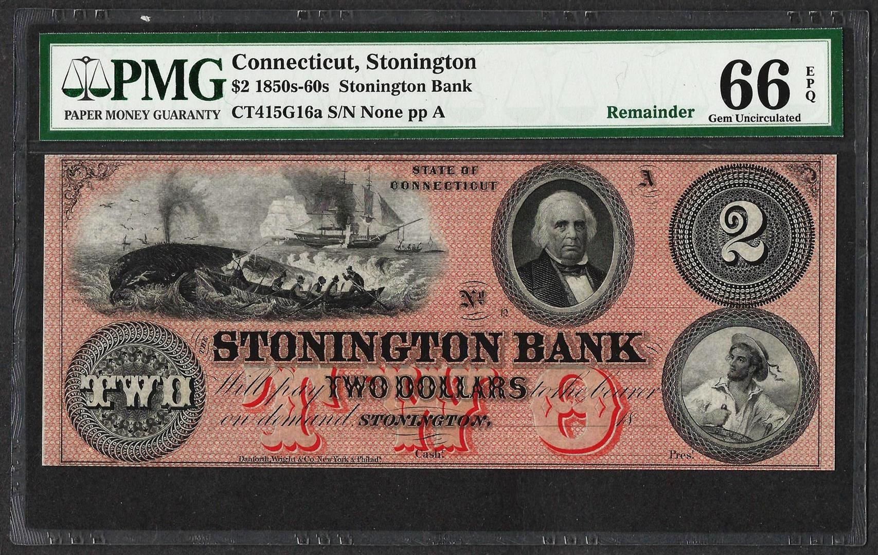 One 1850s-60s $2 Stonington Bank Connecticut Obsolete Note PMG Gem Uncirculated 66EPQ. PMG Certified.