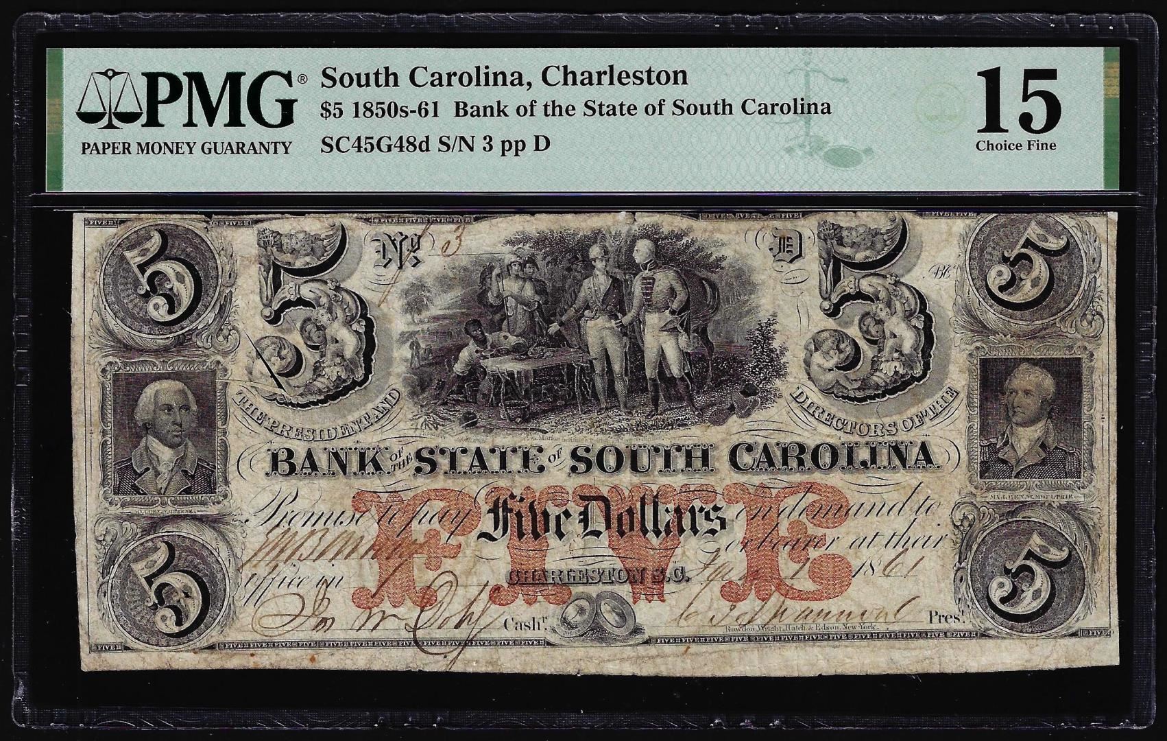 One 1850s-61 $5 Bank of the State of South Carolina Obsolete Note PMG Choice Fine 15. PMG Certified.