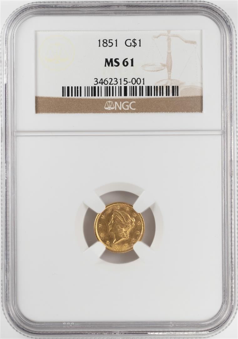 One 1851 $1 Liberty Head Gold Dollar Coin NGC MS61. NGC Certified.