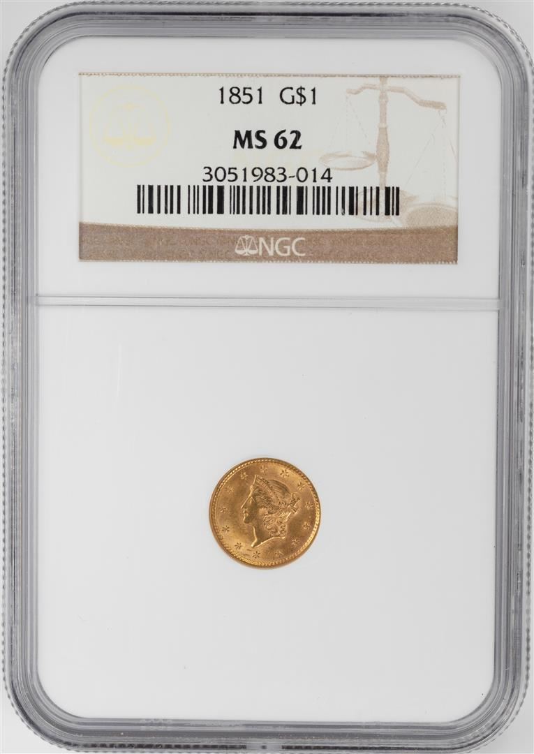 One 1851 $1 Liberty Head Gold Dollar Coin NGC MS62. NGC Certified.