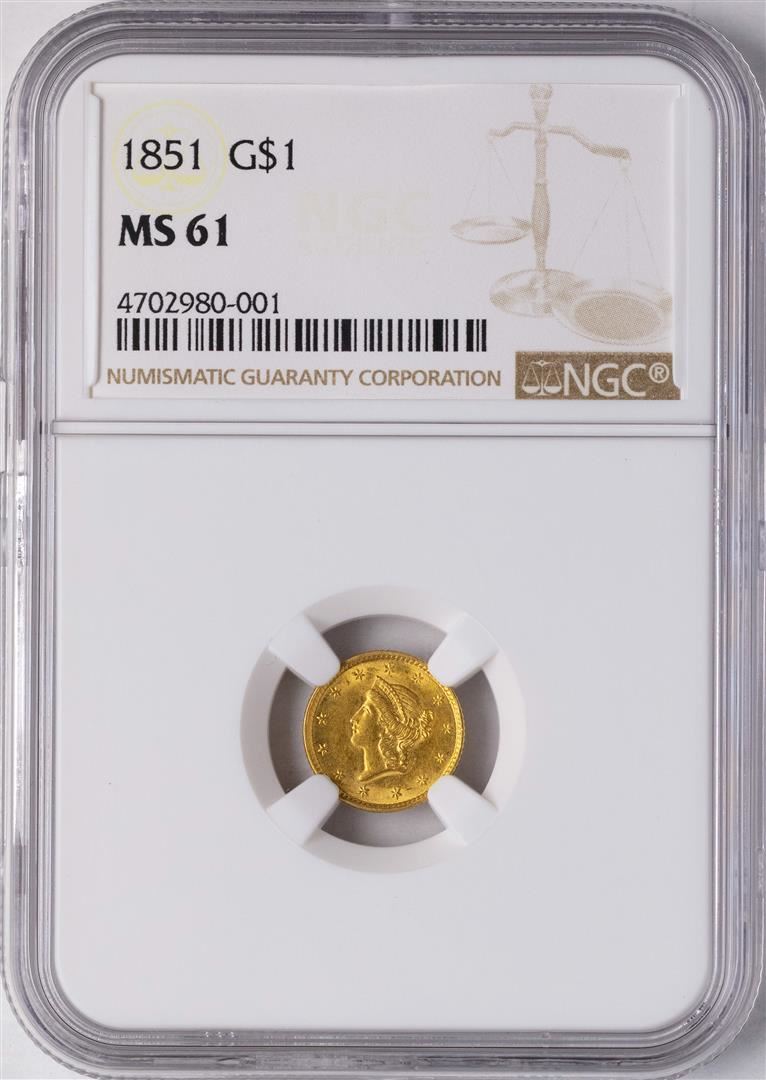 One 1851 $1 Liberty Princess Head Gold Dollar Coin NGC MS61. NGC Certified.