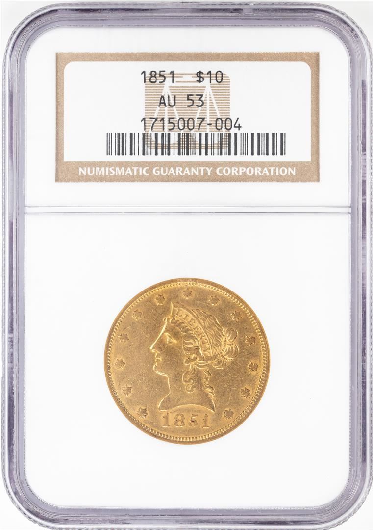 One 1851 $10 Liberty Head Eagle Gold Coin NGC AU53. NGC Certified.