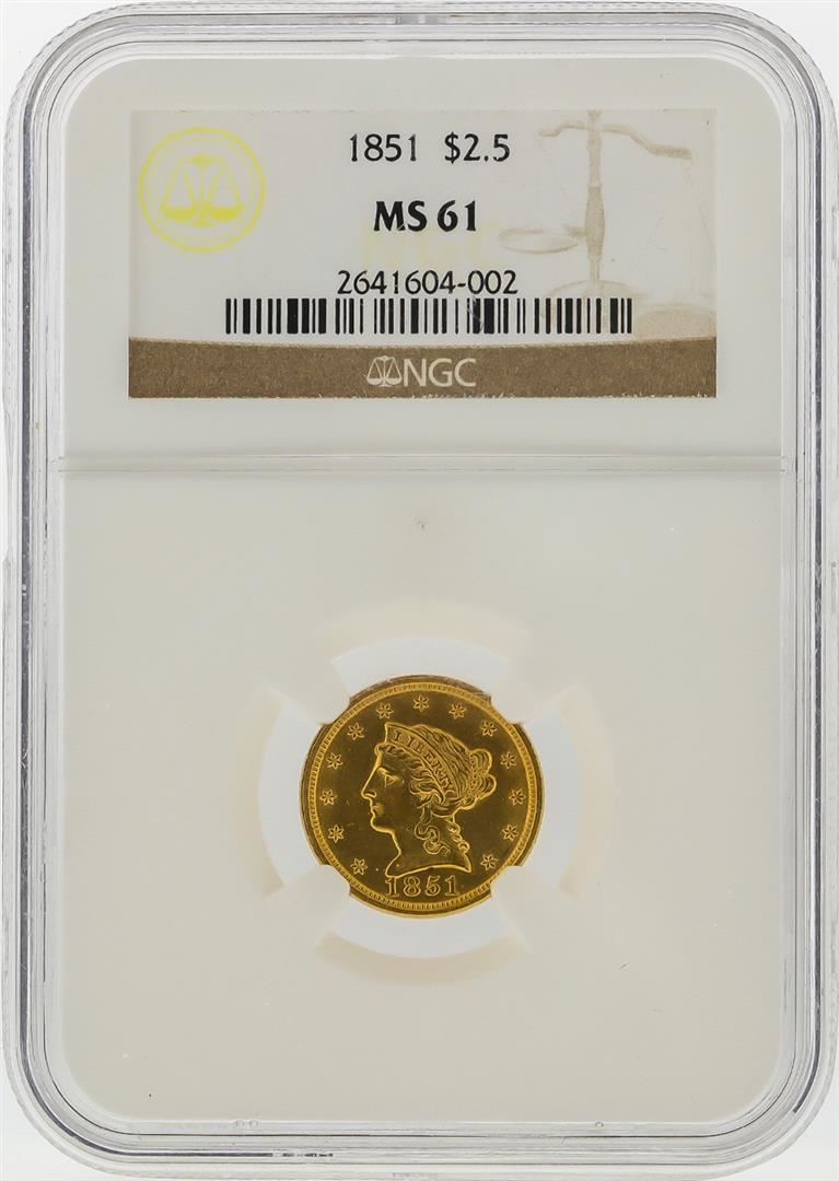 One 1851 $2 1/2 Liberty Head Quarter Eagle Gold Coin NGC MS61. NGC Certified.