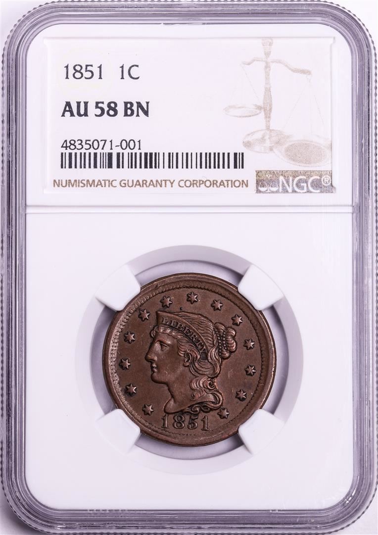 One 1851 Braided Hair Large Cent Coin NGC AU58BN. NGC Certified.