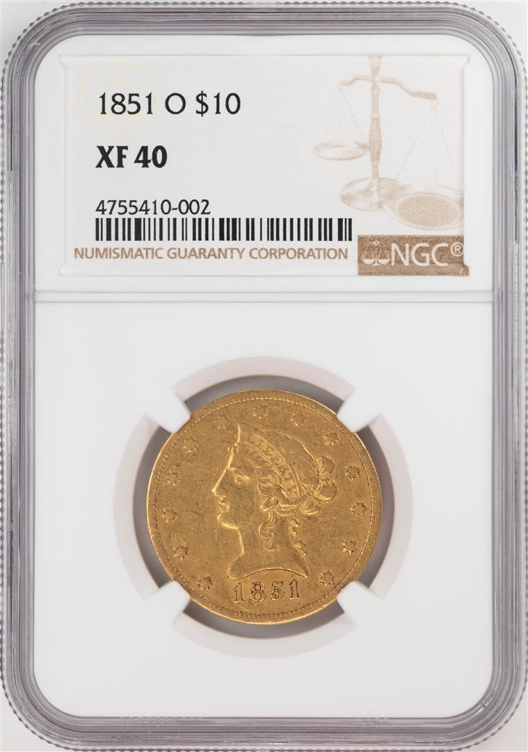 One 1851-O $10 Liberty Head Eagle Gold Coin NGC XF40. NGC Certified.