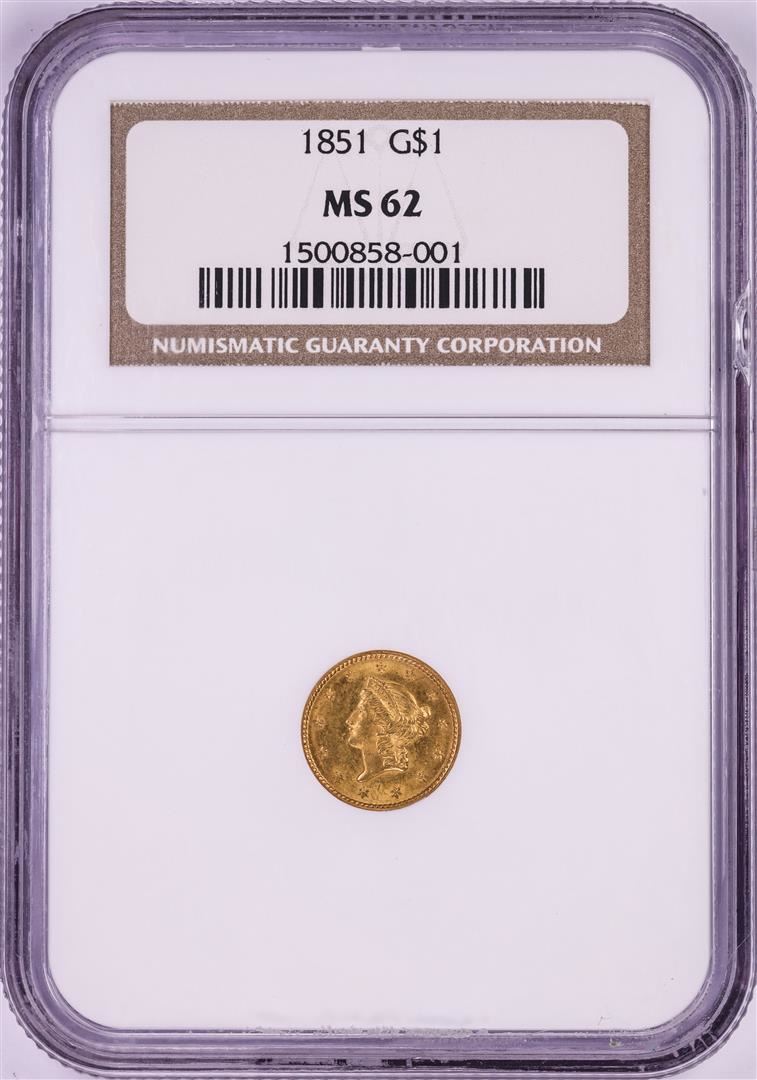 One 1851 Type 1 $1 Liberty Head Gold Dollar Coin NGC MS62. NGC Certified.