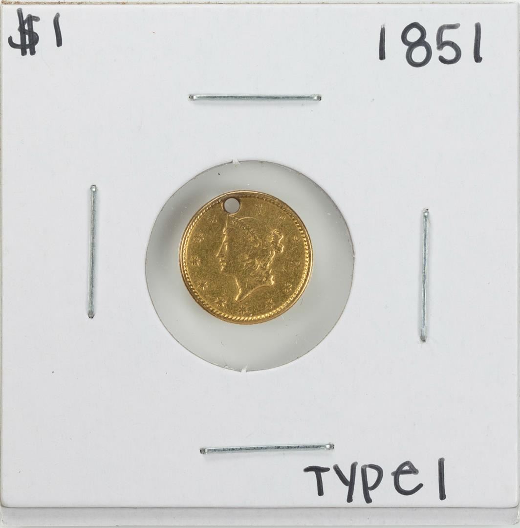 One 1851 Type 1 $1 Liberty Head Gold Dollar Coin with Hole.