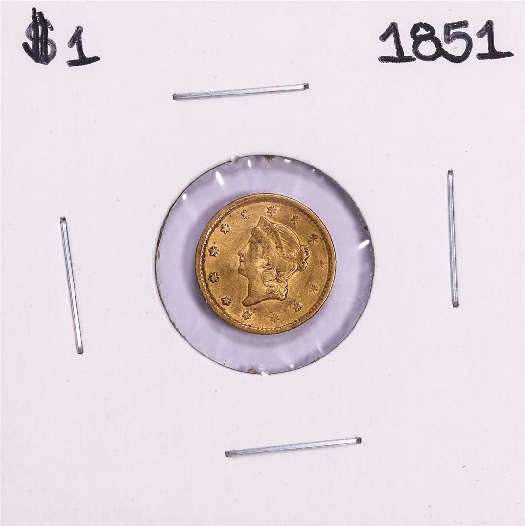 One 1851 Type 1 $1 Liberty Head Gold Dollar Coin. Please reference the included pictures and note the damage on the reverse of the coin.