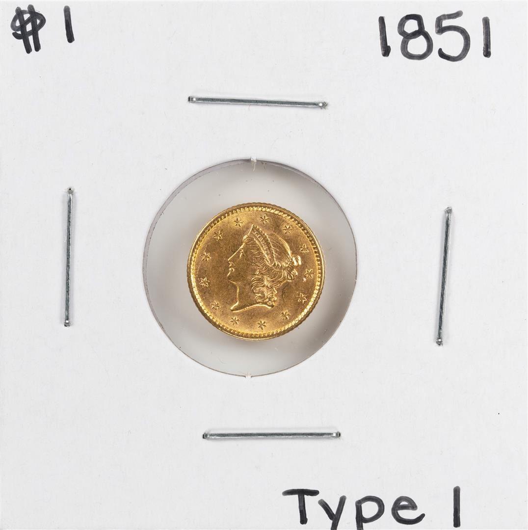 One 1851 Type I $1 Liberty Head Gold Dollar Coin.