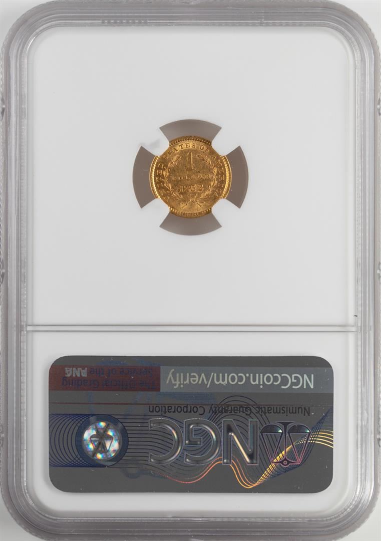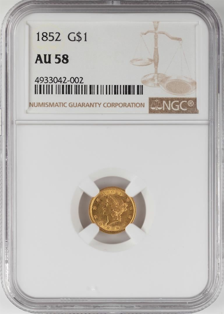 One 1852 $1 Liberty Head Gold Coin NGC AU58. NGC Certified.