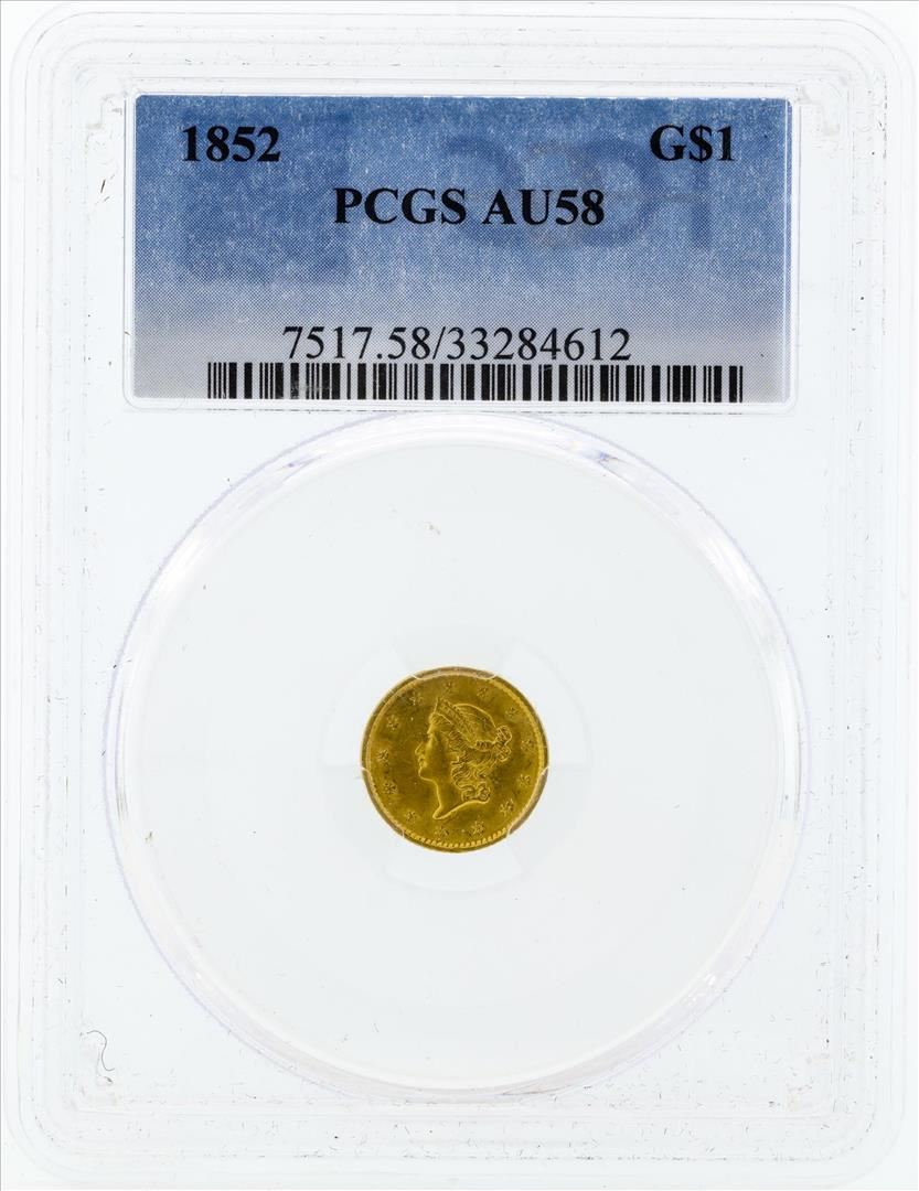 One 1852 $1 Liberty Head Gold Coin PCGS AU58. PCGS Graded.