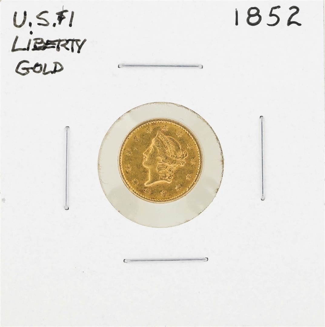 One 1852 $1 Liberty Head Gold Dollar Coin.