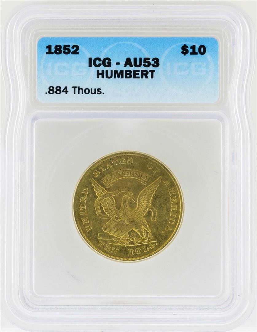One 1852 $10 Humbert Eagle Gold Coin ICG AU53. ICG Certified.