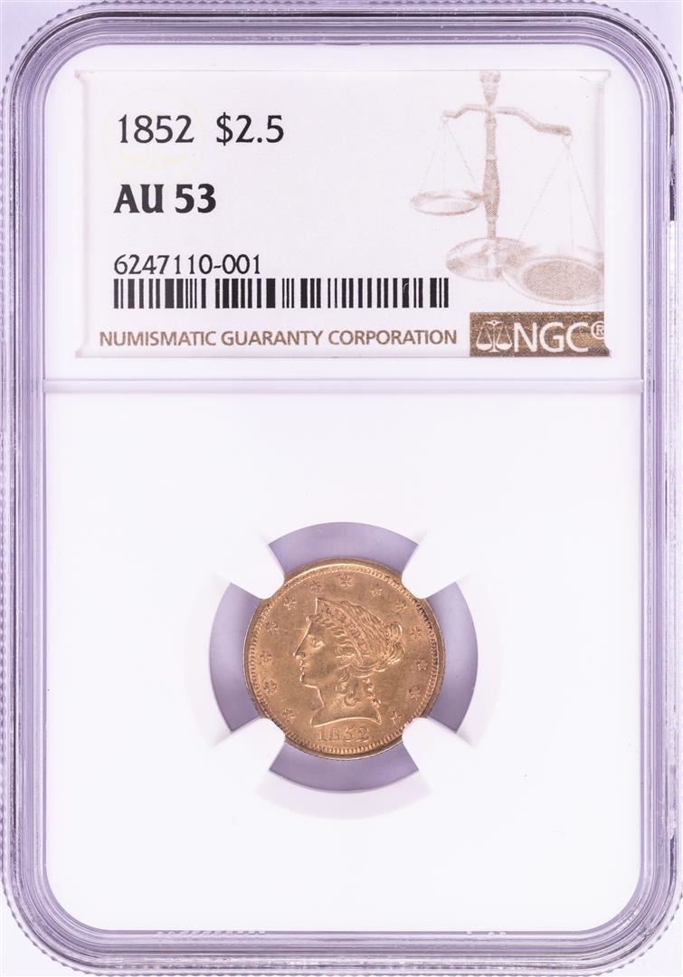 One 1852 $2 1/2 Liberty Head Quarter Eagle Gold Coin NGC AU53. NGC Certified.