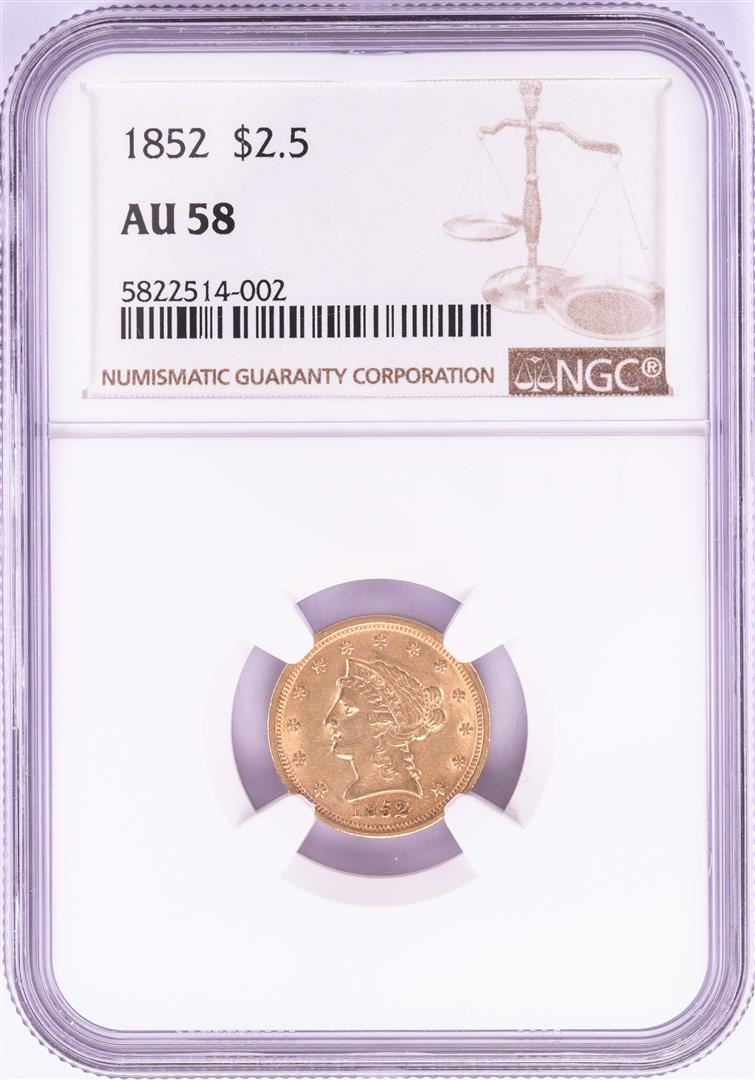 One 1852 $2 1/2 Liberty Head Quarter Eagle Gold Coin NGC AU58. NGC Certified.