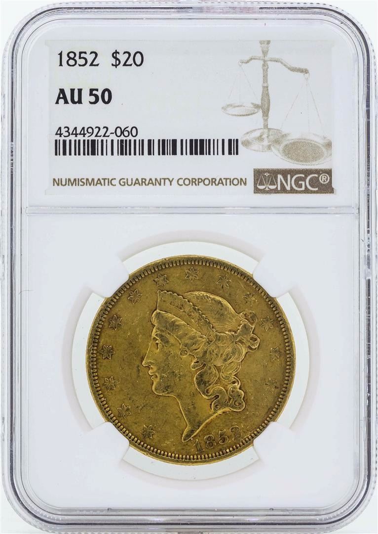 One 1852 $20 Liberty Head Double Eagle Gold Coin NGC AU50. NGC Certified.
