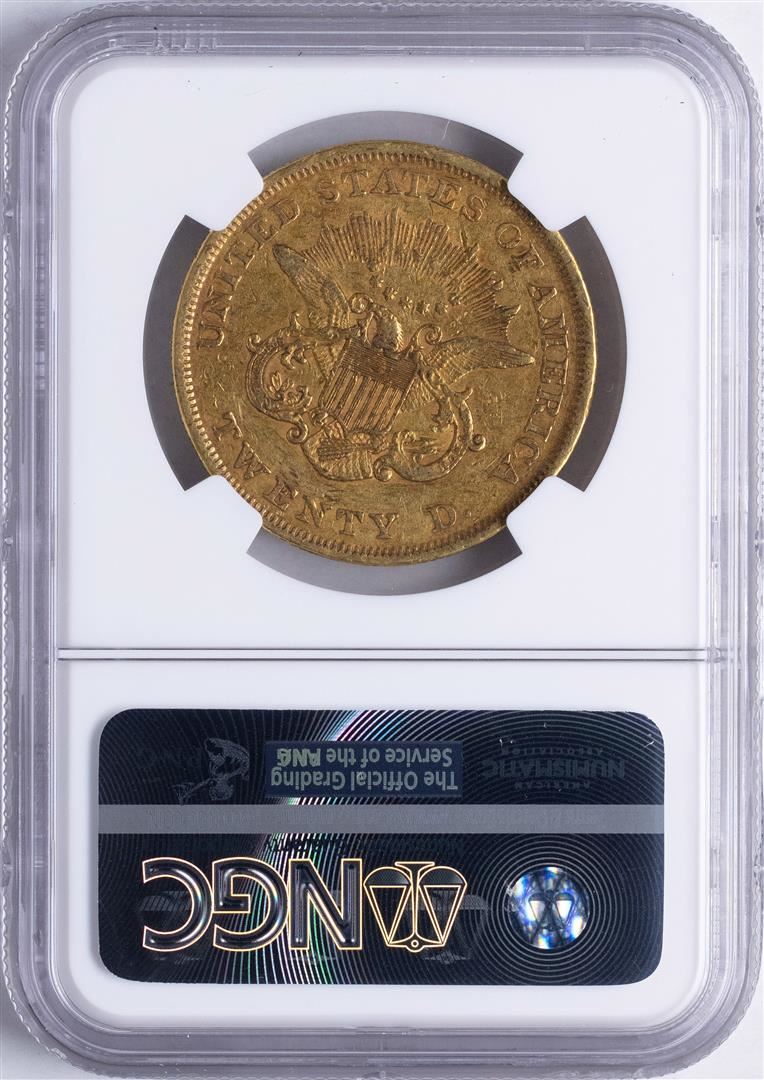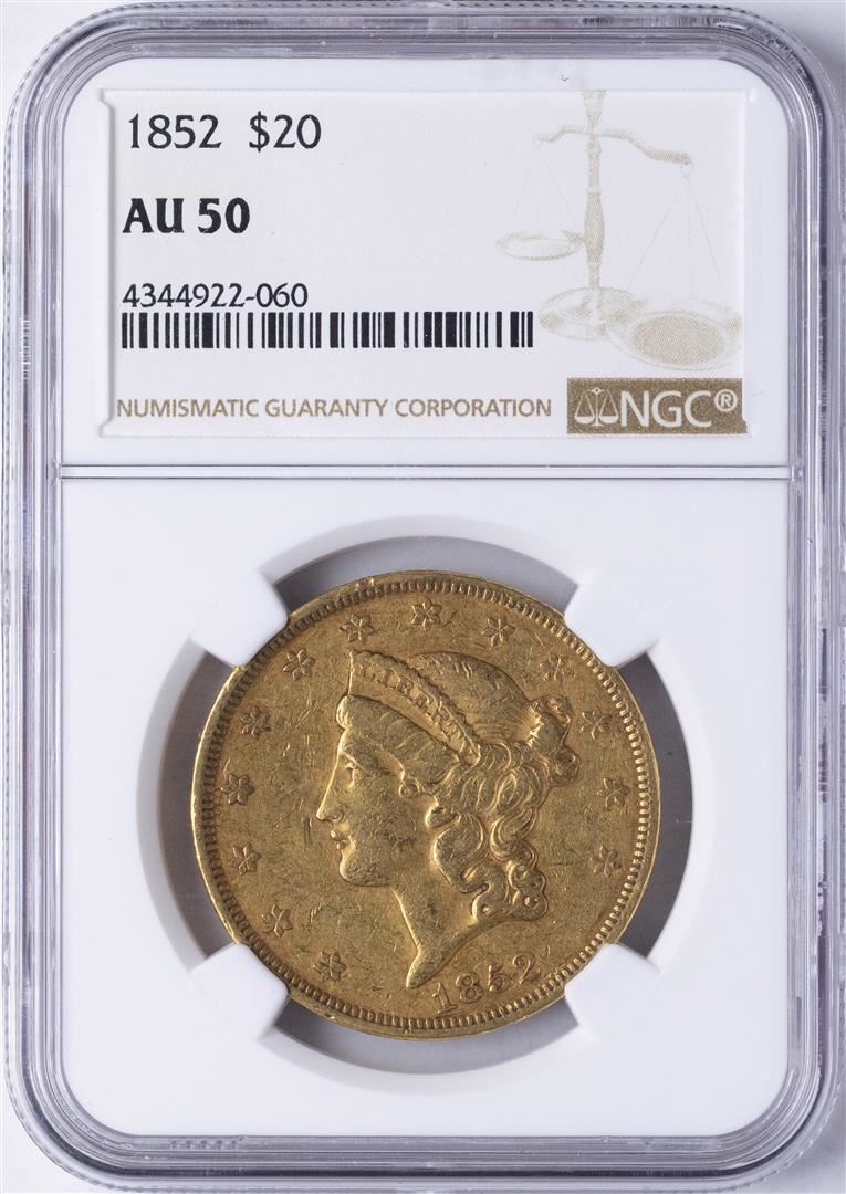 One 1852 $20 Liberty Head Double Eagle Gold Coin NGC AU50. NGC Certified.