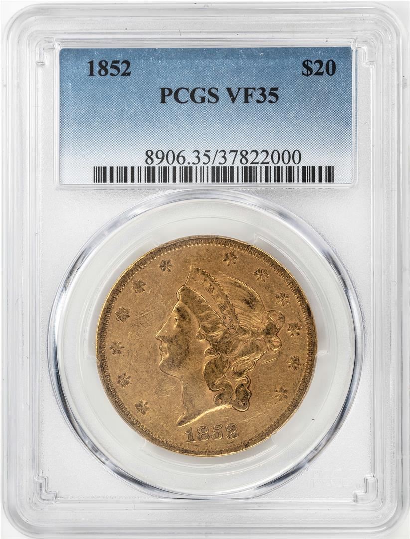 One 1852 $20 Liberty Head Double Eagle Gold Coin PCGS VF35. PCGS Graded.