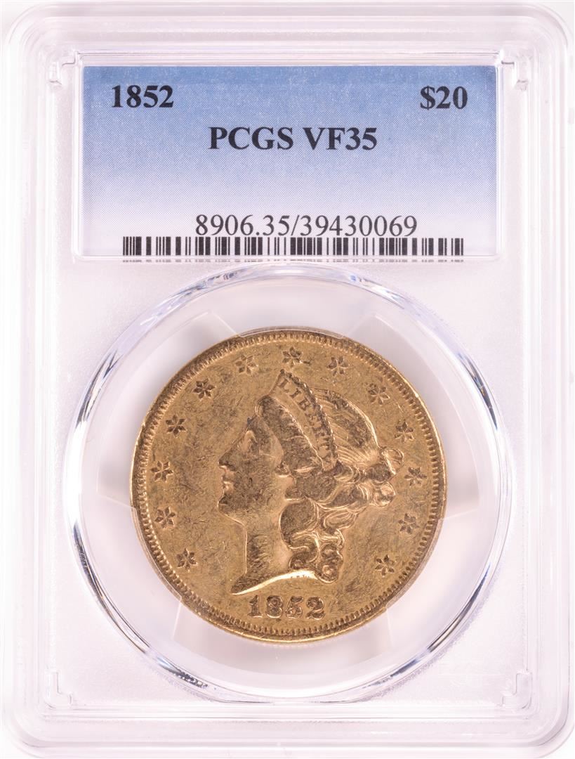 One 1852 $20 Liberty Head Double Eagle Gold Coin PCGS VF35. PCGS Graded.