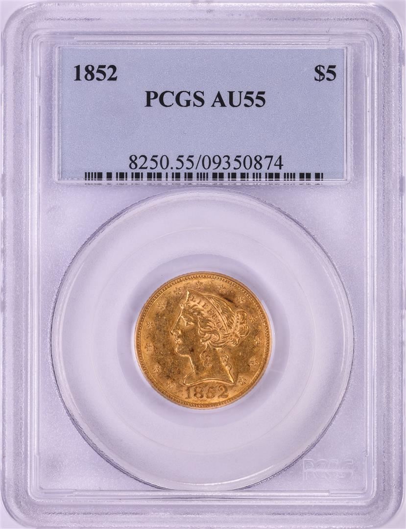One 1852 $5 Liberty Head Half Eagle Gold Coin PCGS AU55. PCGS Graded.