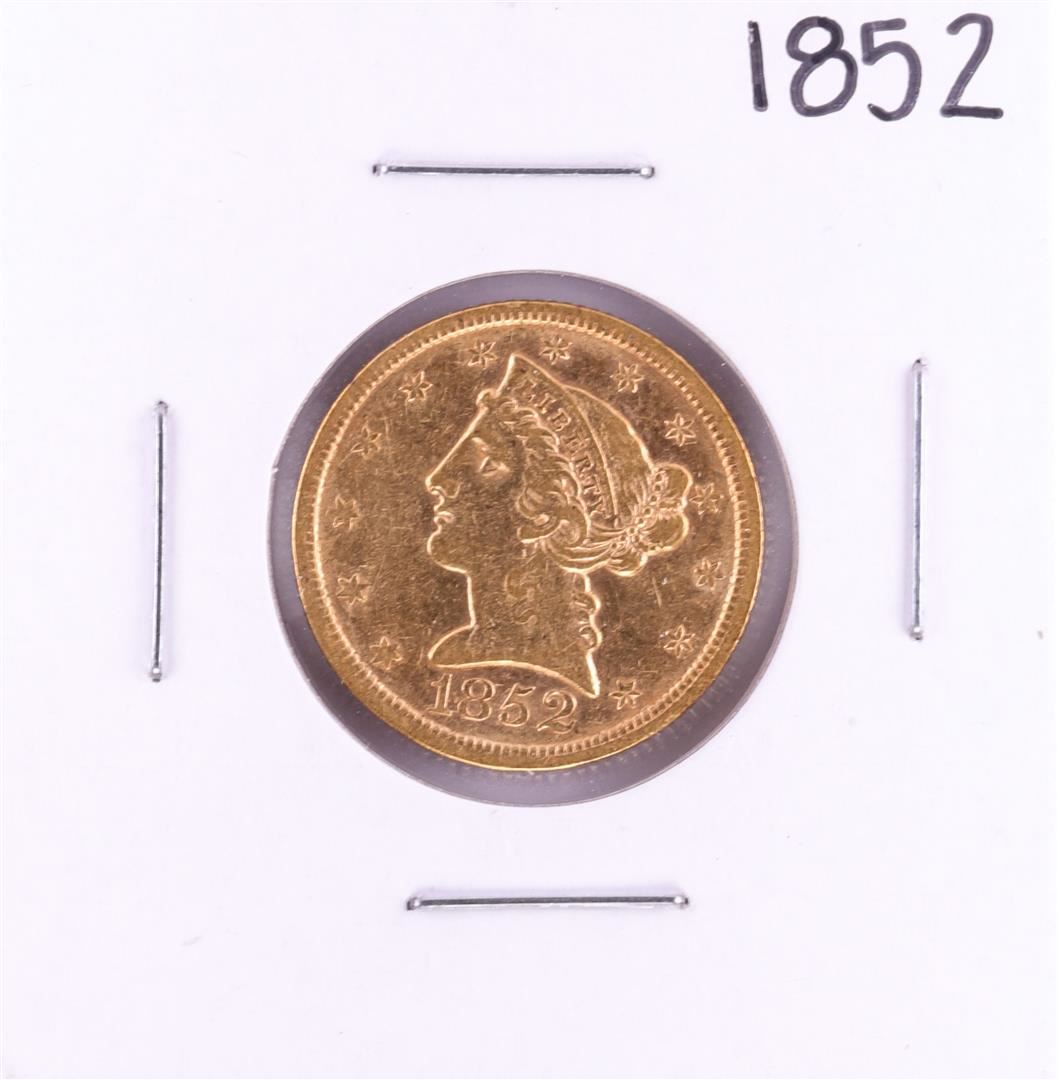 One 1852 $5 Liberty Head Half Eagle Gold Coin.