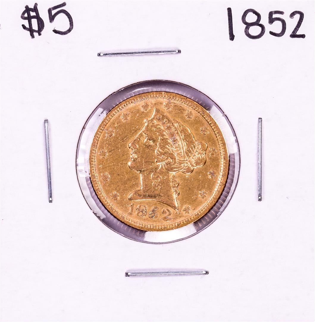 One 1852 $5 Liberty Head Half Eagle Gold Coin.