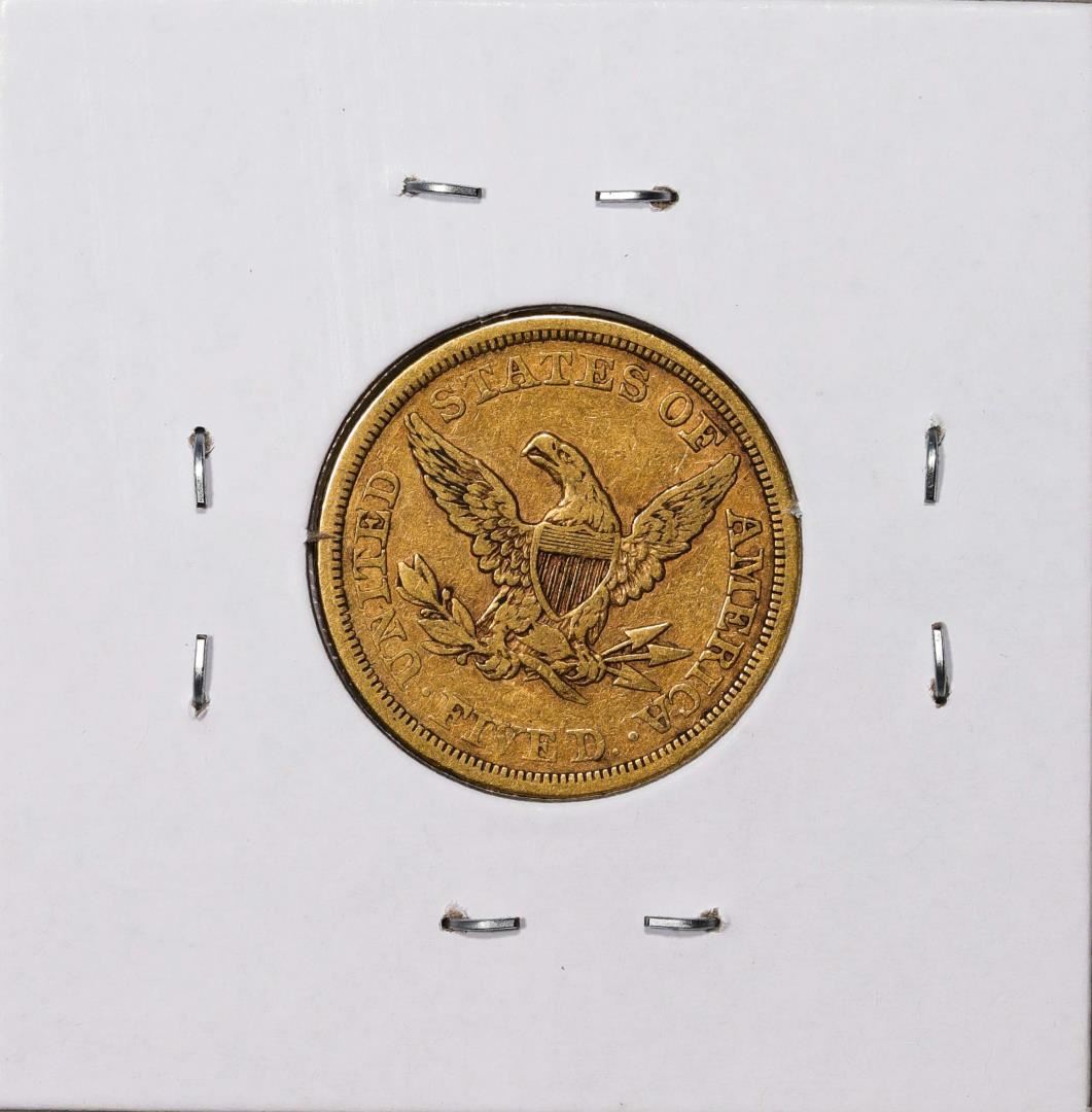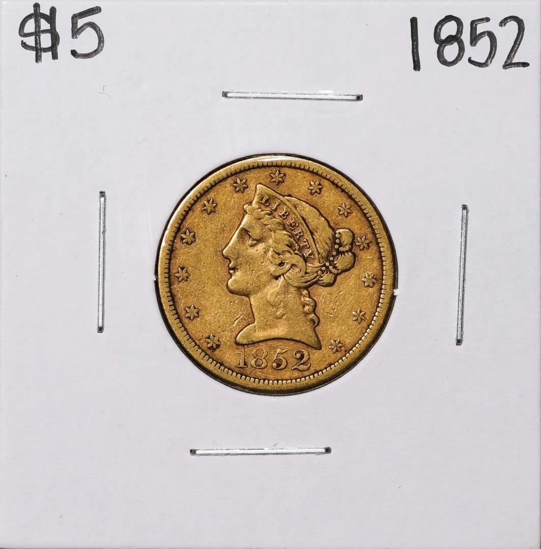 One 1852 $5 Liberty Head Half Eagle Gold Coin.