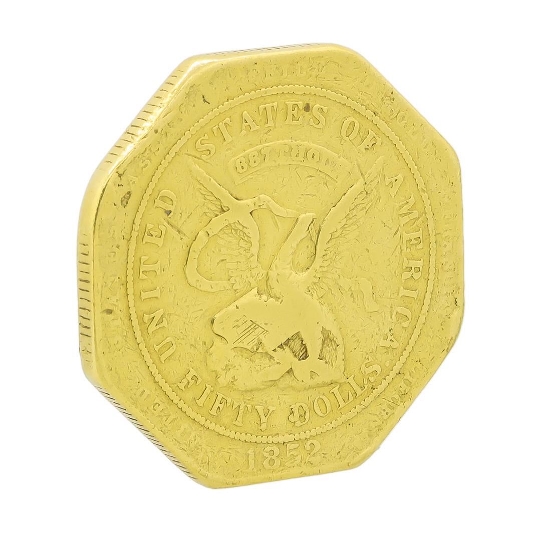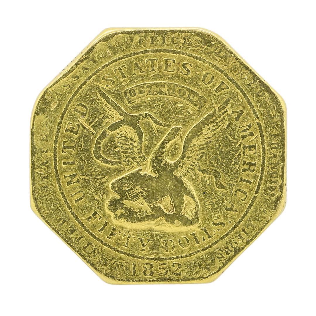 One 1852 $50 '887' Thousand Gold Slug Moffat & Co. Ingot. Although these were officially reffered to as "ingots" these famous fifty dollar pieces were often reffered to as "slugs", they were produced during the early Gold Rush years of 1850-1853 in San Francisco and had only slight variations throughout. This "slug" was issued by "The United Assay office ofr Gold" and this particular example was from one of the later issues struck after the reorganization of the Moffat & Company, a successfull firm that later evolved into the first U.S. Mint in San Francisco. This "slug" displays moderate wear and bumps from its time in circulation but is still a great example of this highly collectible, rare ingot, and would certainly make a great addition to any collection. 1852 $50 moffat .887 moffat enjoyed the highest reputation of all California private mints. The federal government asked the 2 surviving members of the firm to initiate the San Fransisco mint. In 1851 and 1852 the united states assay office under moffat & co. with Augustus Humbert produced the $50 "slugs" probably less than 50 survive in all grades.