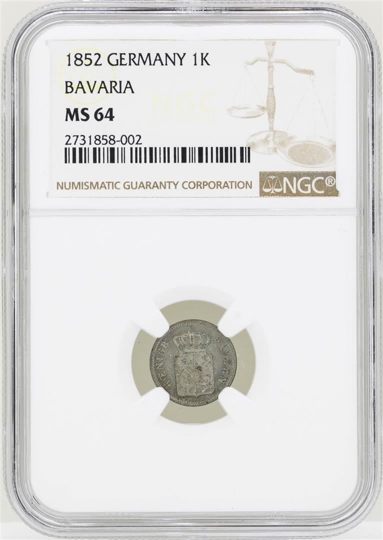 One 1852 Germany Kreuzer Bavaria Coin NGC MS64. NGC Certified.