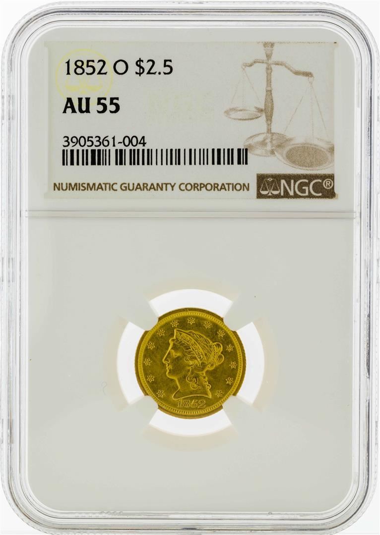 One 1852-O $2 1/2 Liberty Head Quarter Eagle Gold Coin NGC AU55. NGC Certified.