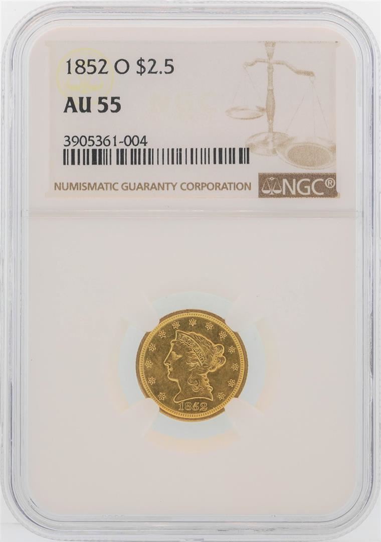 One 1852-O $2 1/2 Liberty Head Quarter Eagle Gold Coin NGC AU55. NGC Certified.