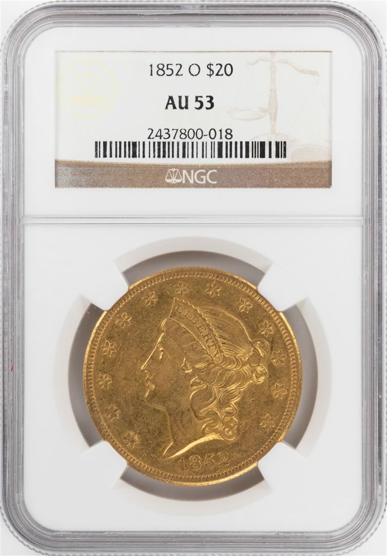 One 1852-O $20 Liberty Head Double Eagle Gold Coin NGC AU53. NGC Certified.
