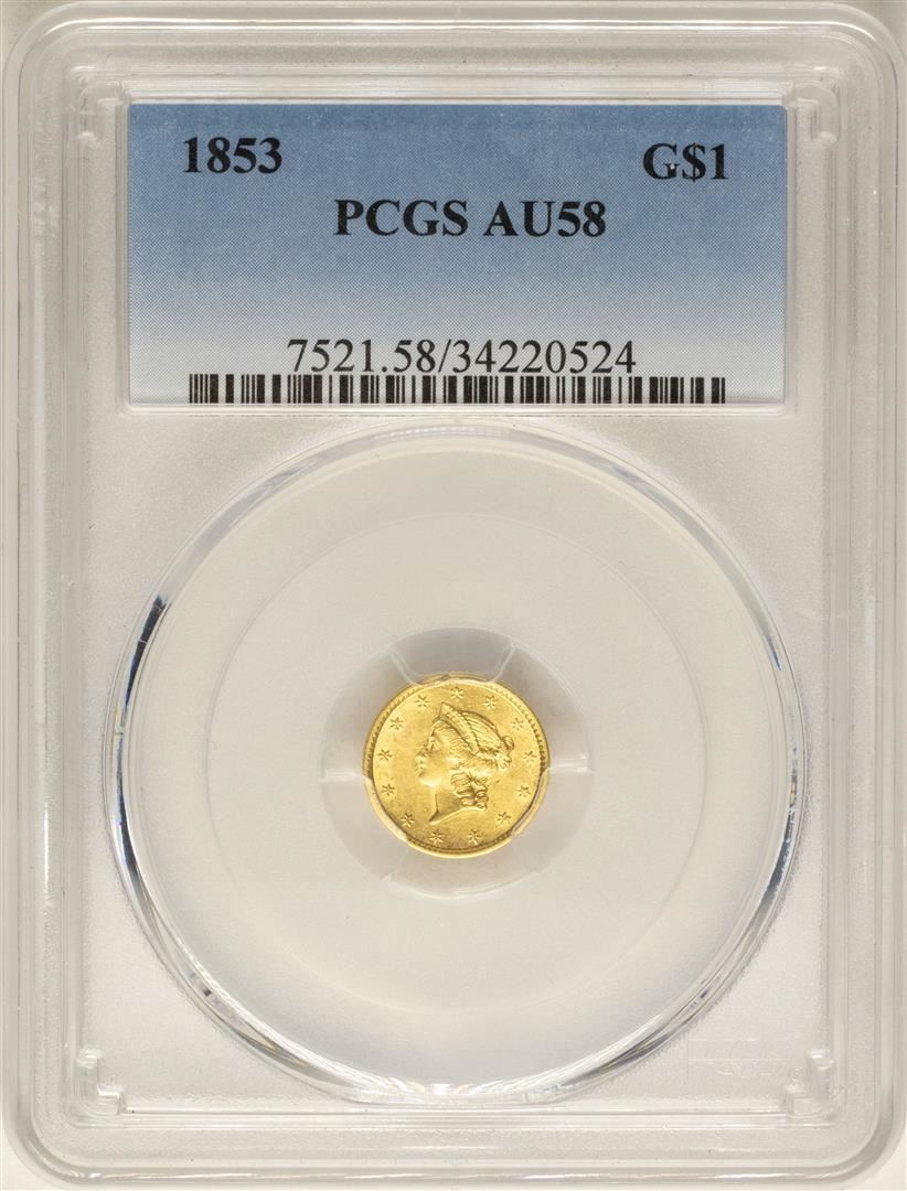 One 1853 $1 Liberty Head Gold Dollar Coin PCGS AU58. PCGS Graded.