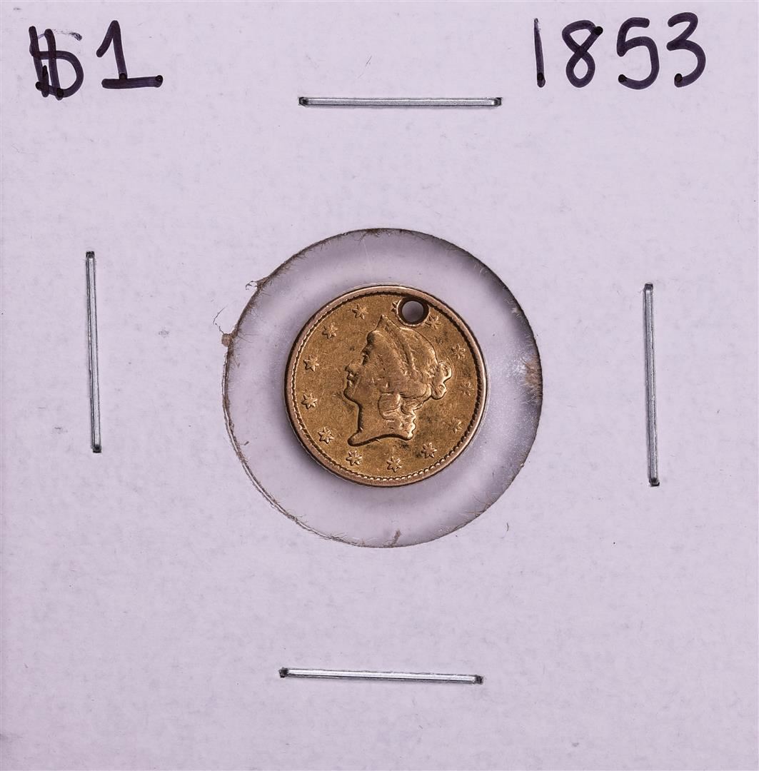 One 1853 $1 Liberty Head Gold Dollar Coin w/Hole.