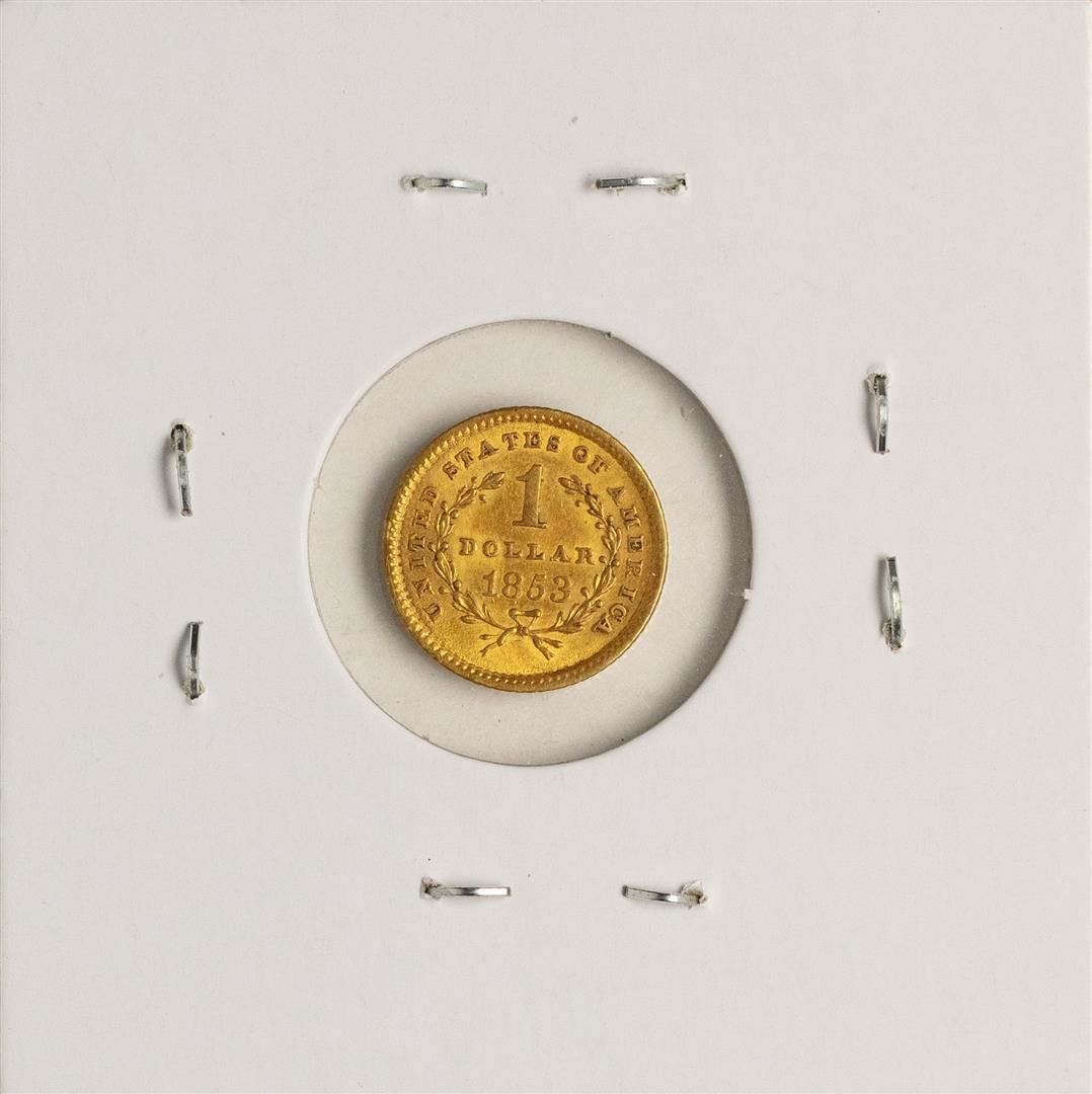 One 1853 $1 Liberty Head Gold Dollar Coin.