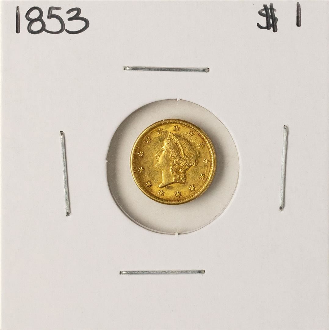 One 1853 $1 Liberty Head Gold Dollar Coin.