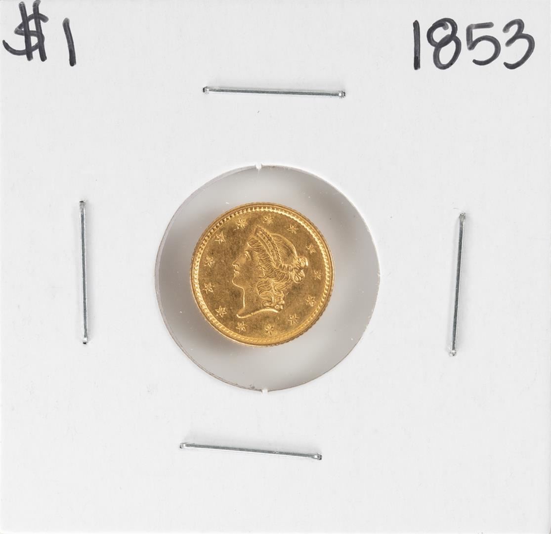 One 1853 $1 Liberty Head Gold Dollar Coin.