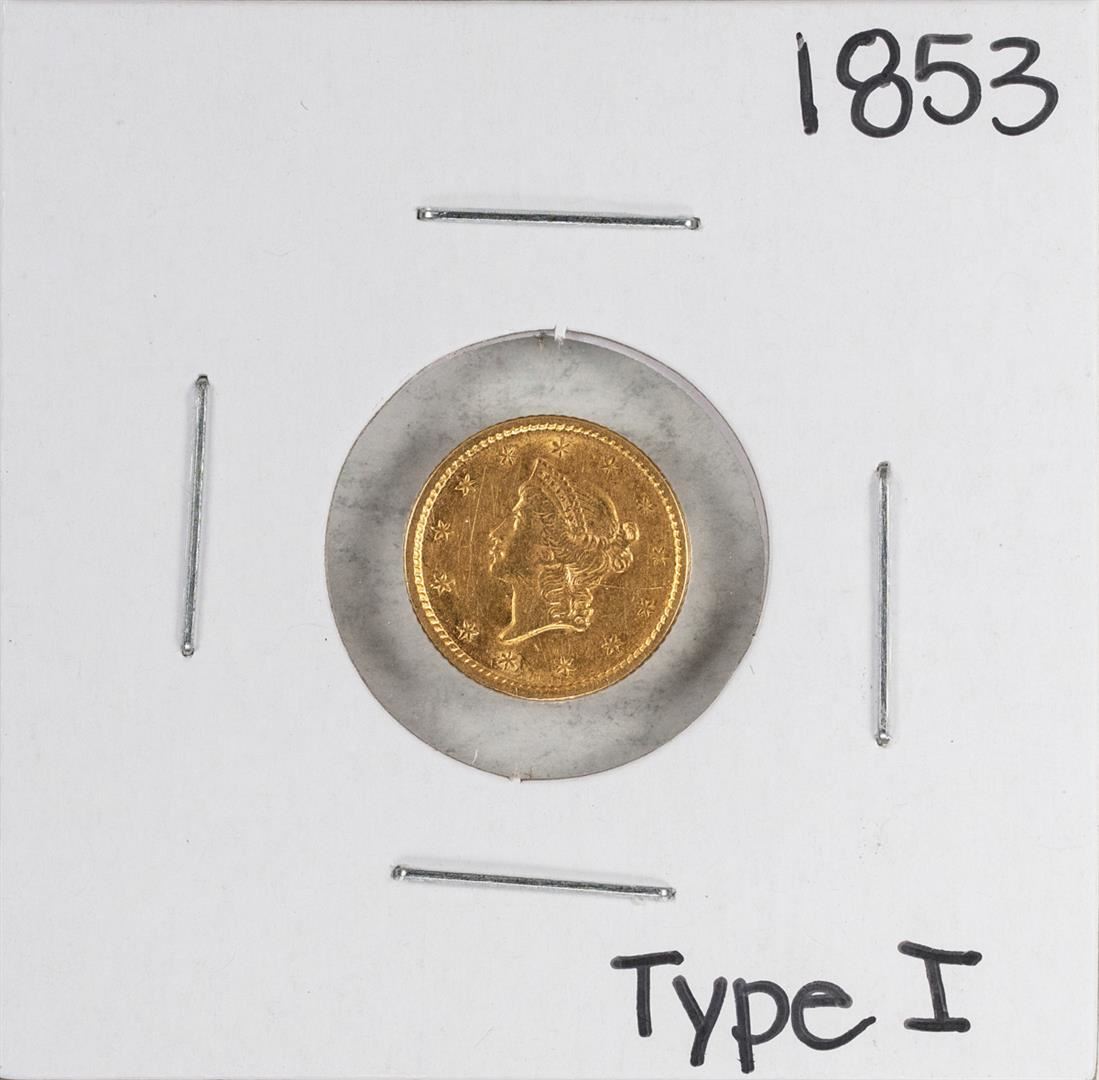 One 1853 $1 Liberty Head Gold Dollar Coin.
