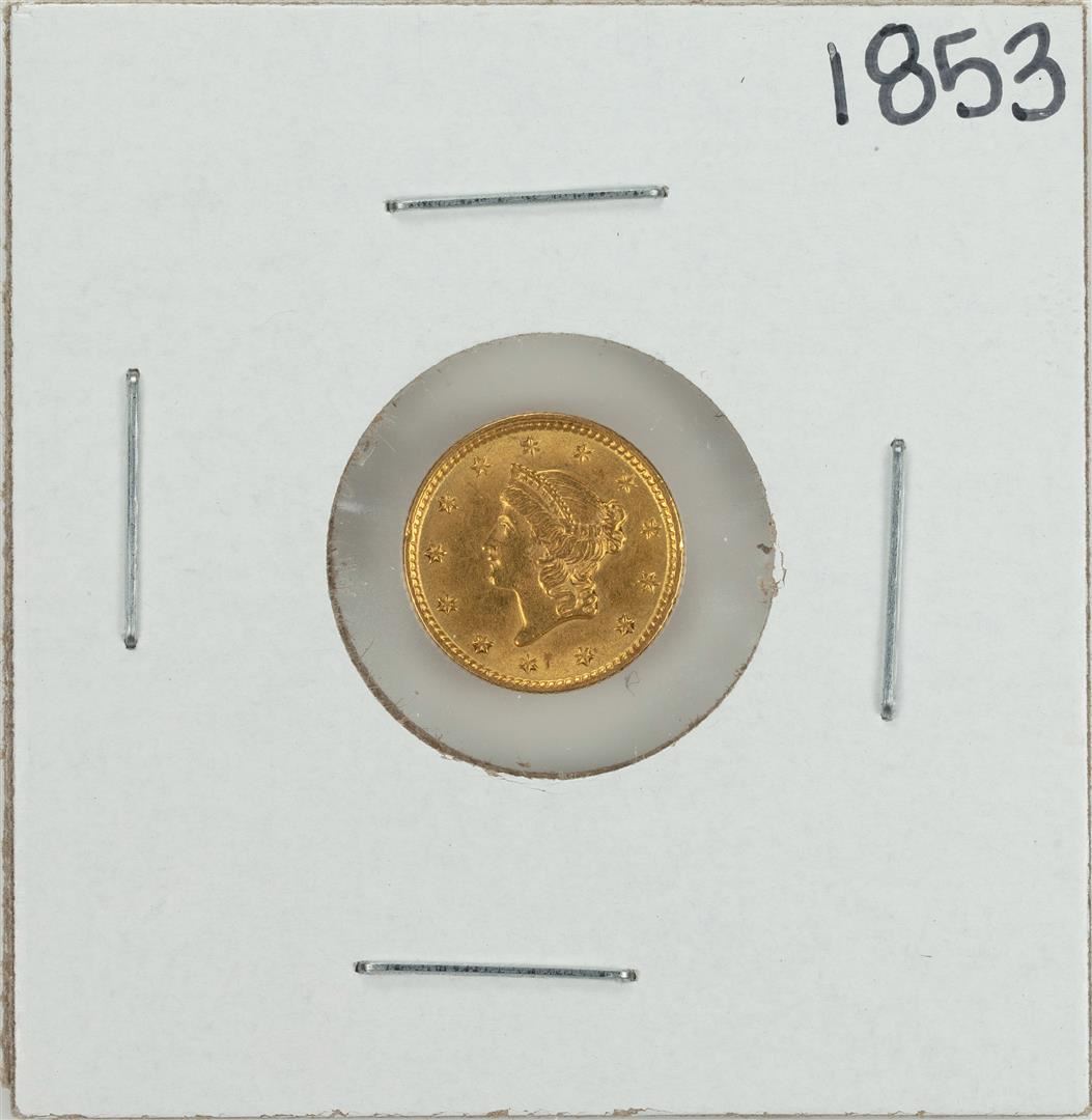 One 1853 $1 Liberty Head Gold Dollar Coin.