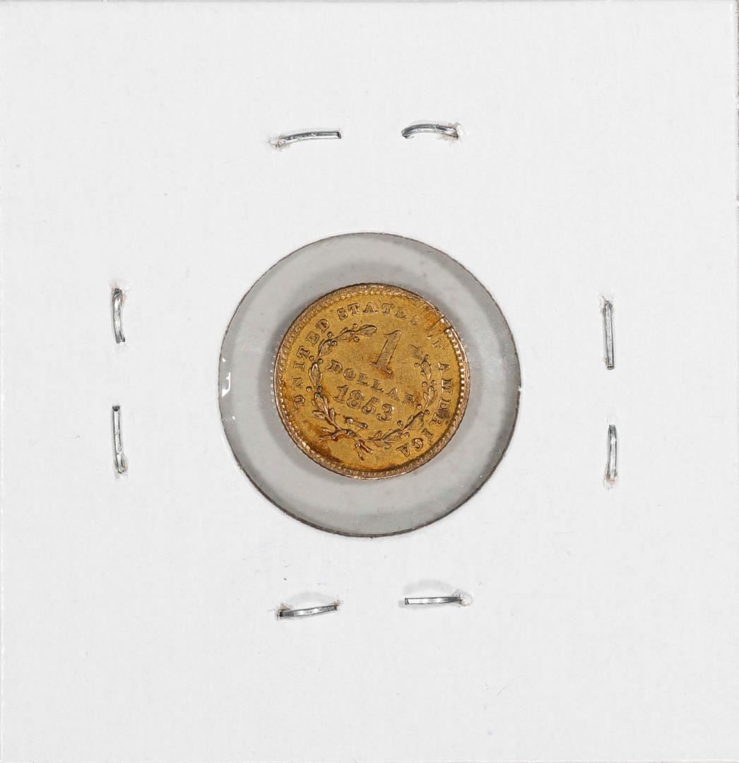One 1853 $1 Liberty Head Gold Dollar Coin.