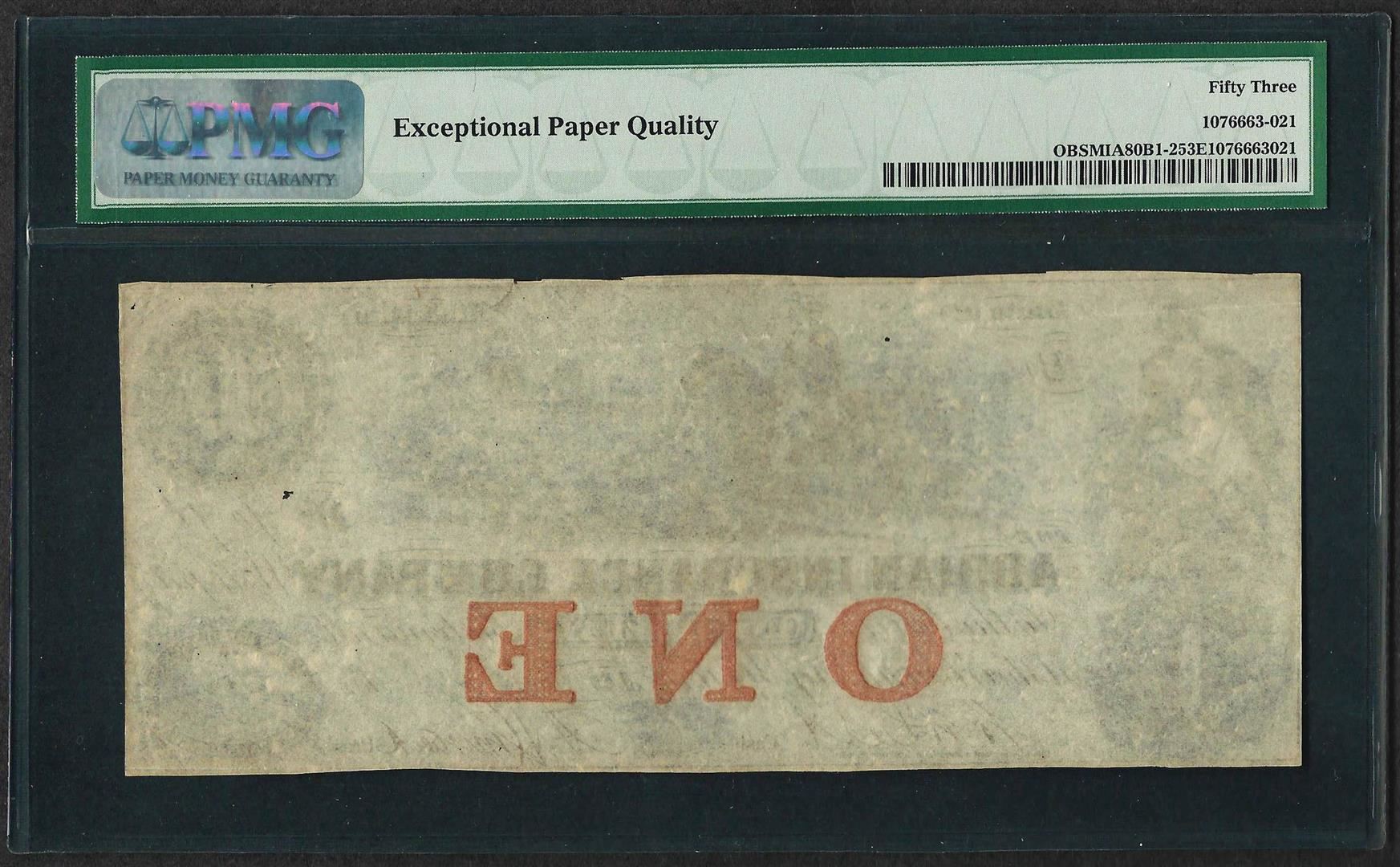 One 1853 $1 The Adrian Insurance Company Obsolete Note PMG About Uncirculated 53EPQ. PMG Certified.