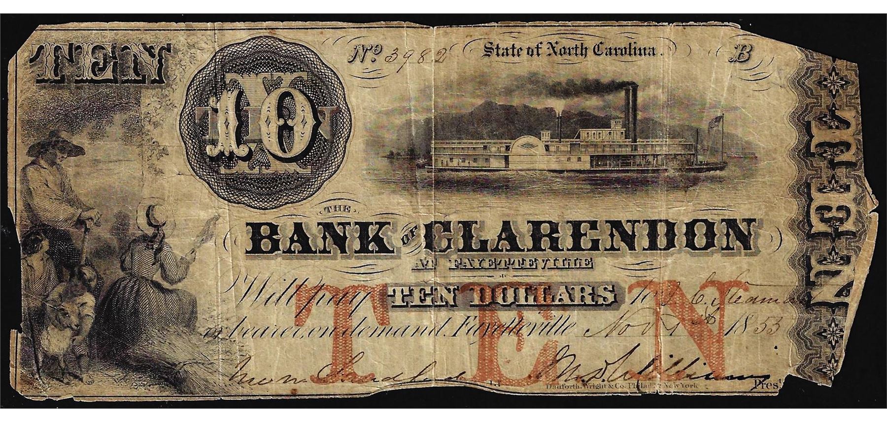 1853 $10 Bank of Clarendon Fayetteville, North Carolina Obsolete Bank Note