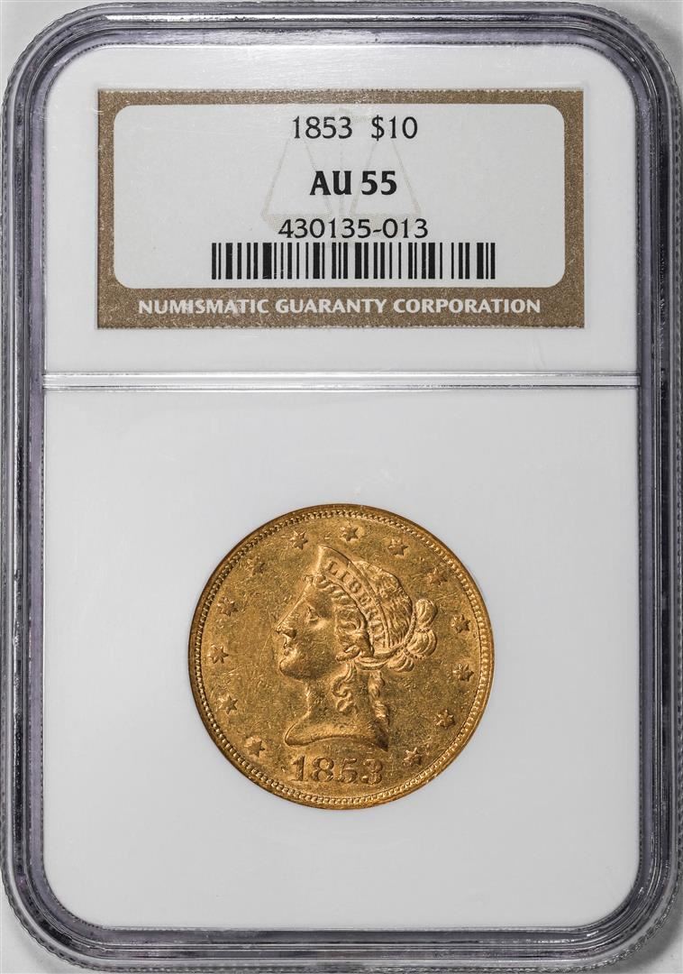 One 1853 $10 Liberty Head Eagle Gold Coin NGC AU55. NGC Certified.