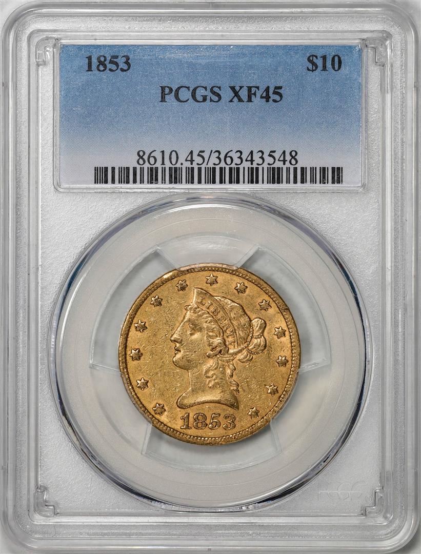 One 1853 $10 Liberty Head Eagle Gold Coin PCGS XF45. PCGS Graded.